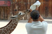 The unnamed female giraffe calf is thriving under the care of zookeepers. Unable to bond with her mother, the calf is being bottle fed four times a day. Guests can see her in the giraffe yard throughout the day and might even catch one of her mid-day feedings around 11 a.m. or 1:30 p.m. BioPark Facebook fans can vote through May 3 - 10 on their favorite name for the calf.