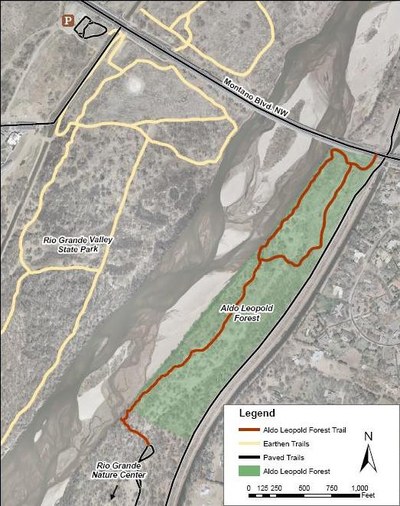 Dedicated on February 15, 2009 the Forest is approximately 53 acres in size, extending from the north boundary of the Nature Center to the southeast side of the Montaño Bridge. Plans for the forest include a naturally surfaced trail extending from the existing paved trail. This trail would connect to the Montaño Bridge and will tie into existing trail systems on the west side of the river at the Pueblo Montano picnic area. After the trail is complete hikers, mountain bikers, and equestrians on both sides of the river will be able to enjoy an improved and expanded trail system.