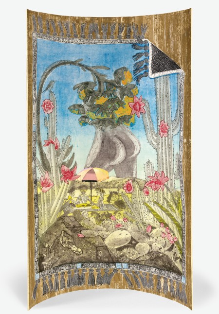 Image: Paula Wilson, In the Desert: Mooning, 2016, collagraph on muslin from two plates, handprinted collage on muslin, and inkjet collage on silk on canvas and wood, ed. of 10, Albuquerque Museum, gift of Nancy Zastudil and the artist, PC2021.23.1
