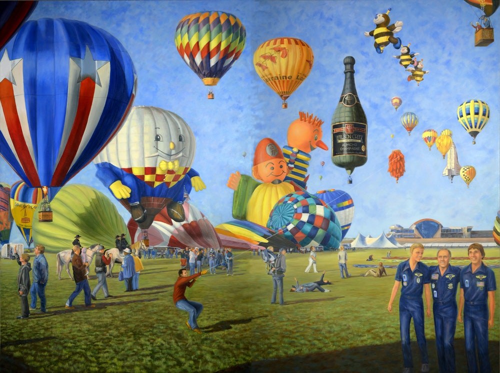 Jane Maclean's original oil painting is composed of five panels, which together measure six feet tall and twenty feet wide. MAGIC was conceived, painted, and exhibited for the largest art competition in the world, Art Prize, in Grand Rapids, Michigan. Understanding the power of historical images, Jane created MAGIC as a historical narrative. In it are authentic balloons and ballooning celebrities with wonderful stories. To gain permission to portray specific balloons and people, she contacted balloonists, and families of balloonists, from around the United States, and indeed the world.