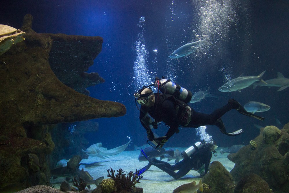 And these vicious predators aren’t so vicious—divers swim alongside them every day during their Shark Tank dives at 2 p.m.