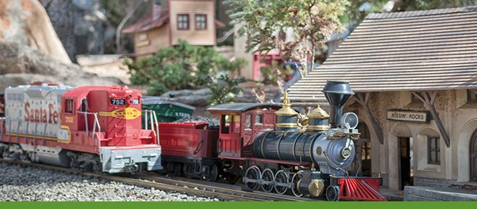 Two 400-foot loops of G-scale brass rails on free-floating tracks pass by villages, over trestle bridges and through tunnels.