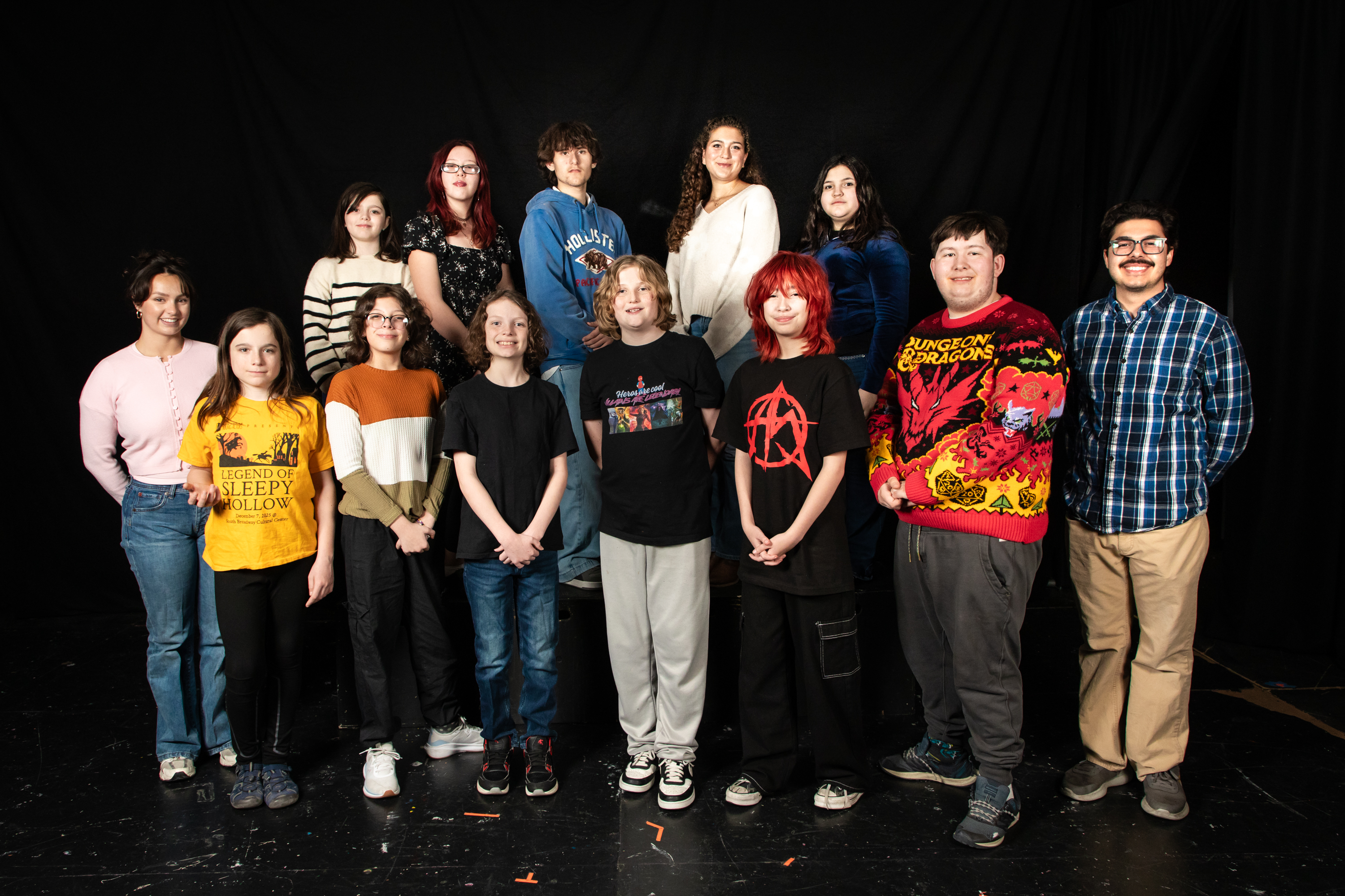 Group of thirteen diverse teenagers standing on a stage with a black backdrop, dressed in casual clothing and facing the camera.