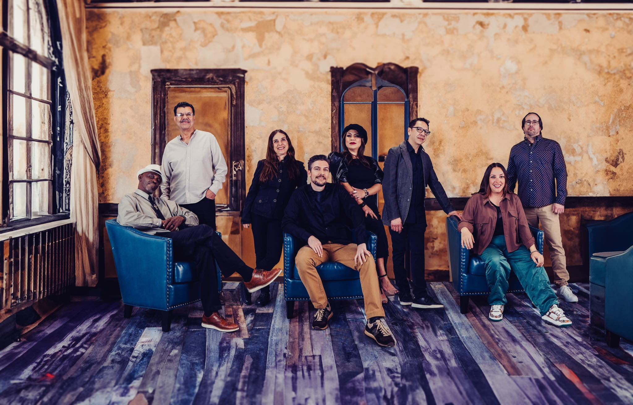 Seven diverse adults posing in a rustic room with textured walls and large windows, some seated on blue armchairs and others standing.