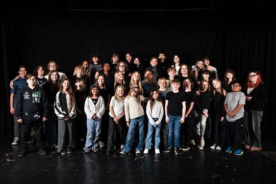 Large group of diverse young people standing together against a black backdrop, smiling and posing for a group photo.