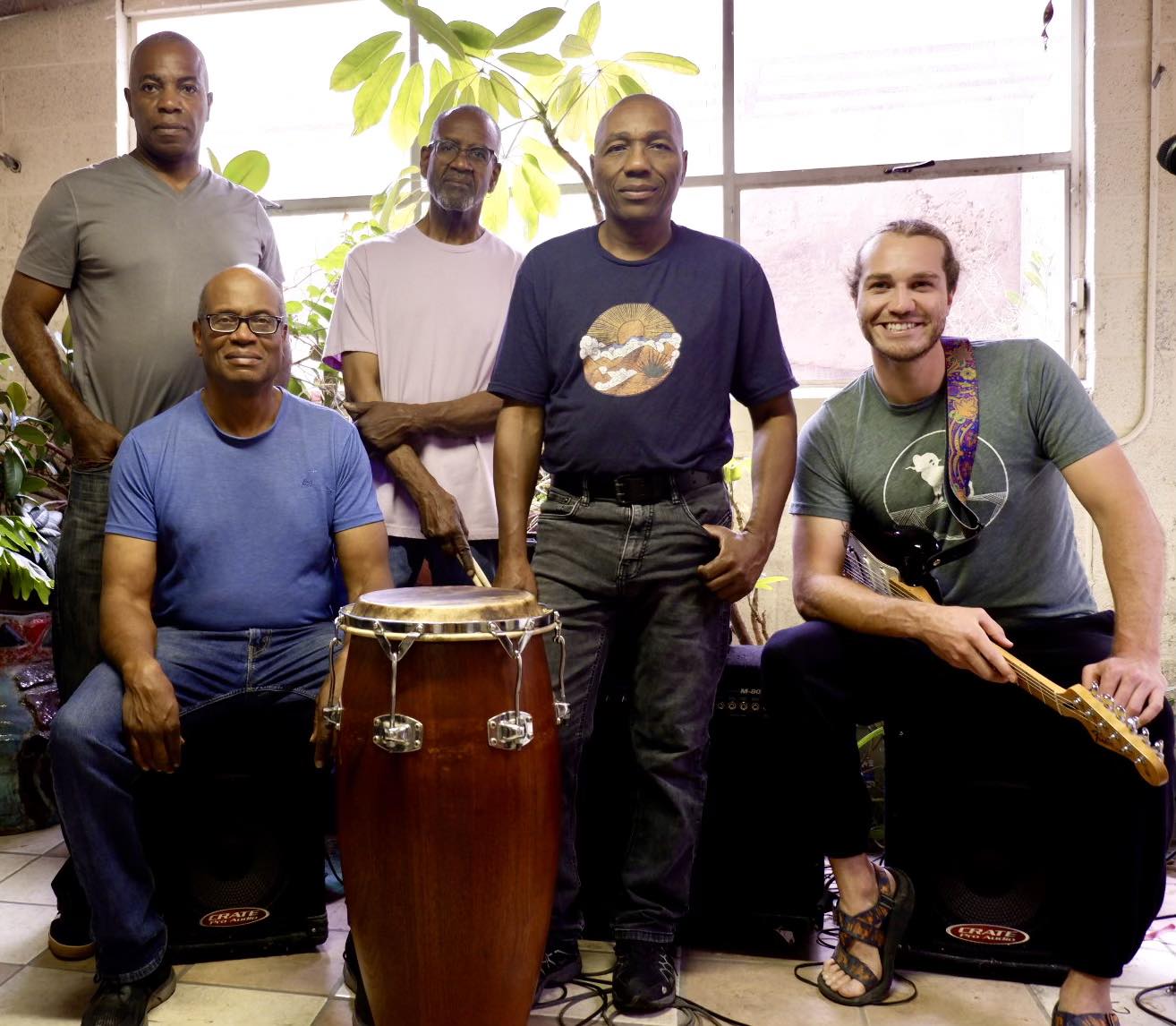 Five men posing indoors with musical instruments including a conga drum and an electric guitar near large windows and plants.