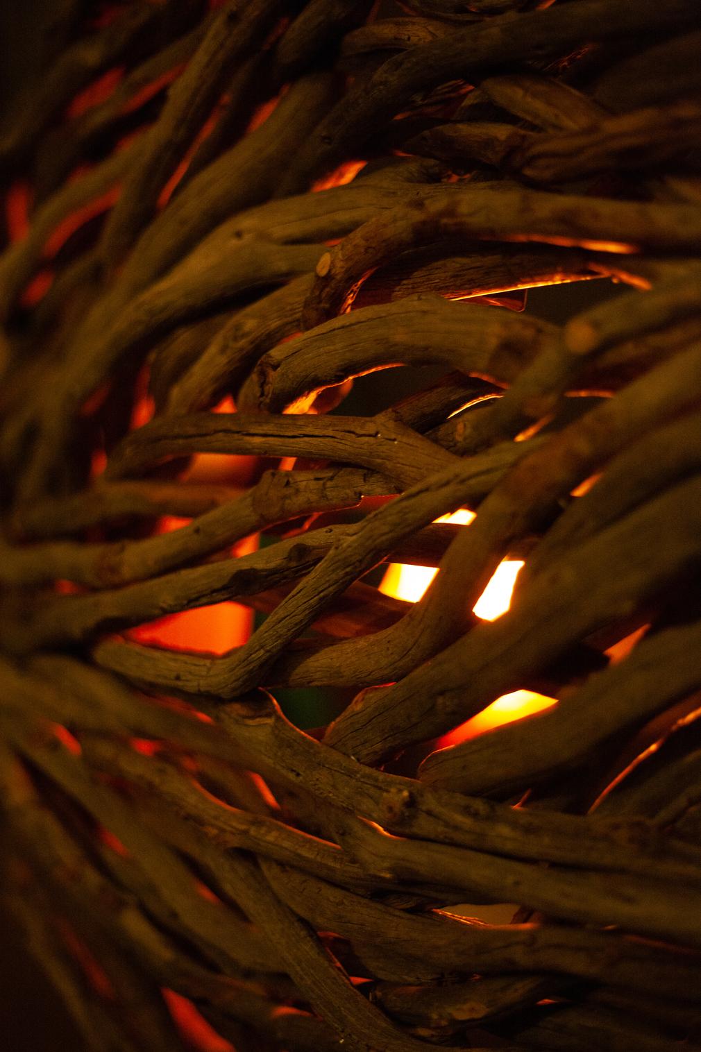 Description: Cameron Krow's light-filled spherical sculpture is inspired by a poetic inquiry into what it means to hold onto and project the light in a world that often feels overwhelmed by darkness. Cosm glows from within, emitting soft, diffused light and is composed of piñon and juniper branches, concrete rubble, welded steel, LED lights, and glass. It appears at once as a planetary object which has crashed in from the heavens and as some kind of ore which is being pushed out from the earth's core. The title references both 'macrocosm' and 'microcosm' to intentionally suspend distinguishing between the two, and attempts to illustrate that it is really all the same thing. There is no inner- and outer-space - there's just space. What is earthly is also heavenly. What is light is also stardust. Once we remember what we really are, we begin to see ourselves in everything else and can then work to live in alignment with that truth, spreading the love that connects us to all things.