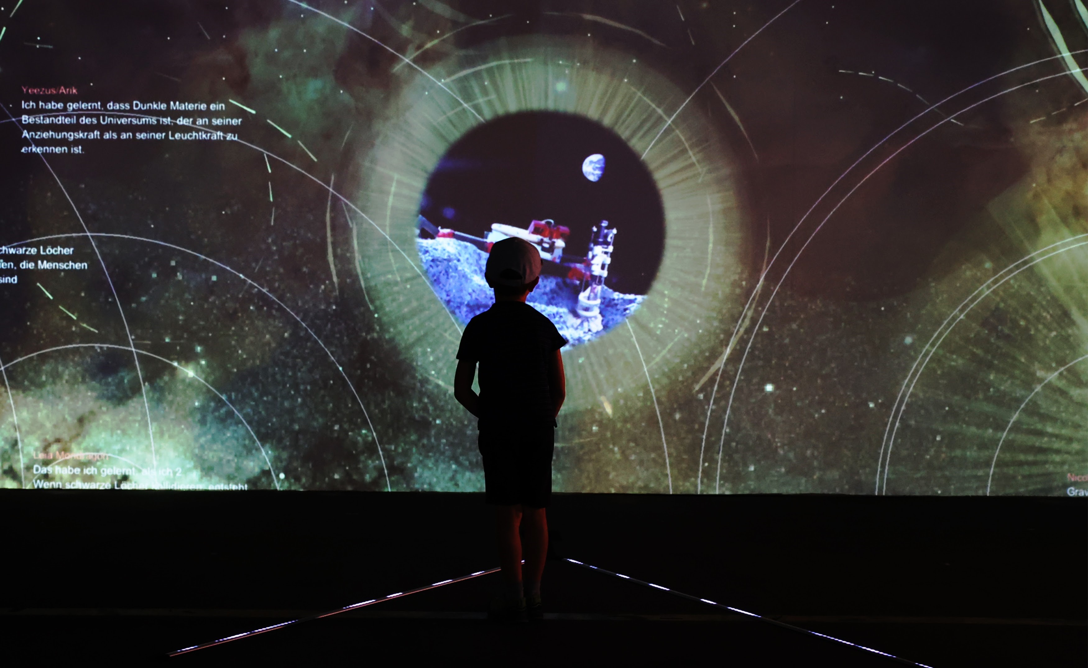 How to engage: Activate your silhouette, comprised of hundreds of video statements, to reveal thoughts and reflections about the universe; Scan our QR code to send your space messages about the universe and see them appear in real time on the wall; and engage with Science Stations to ask questions and develop your science literacy!