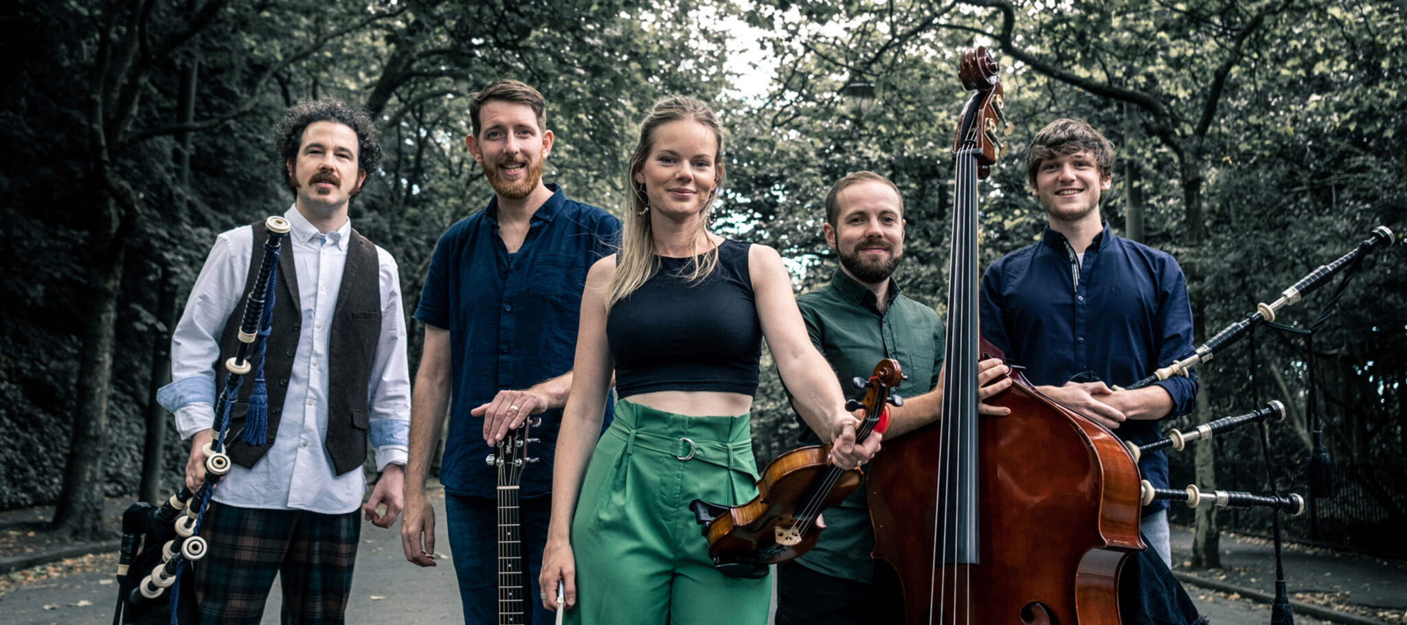 Breabach is made up of Megan Henderson (Fiddle, Vocals, Step Dance), James Lindsay (Double Bass, Vocals), Calum MacCrimmon (Bagpipes, Whistle, Bouzouki, Vocals), Conal McDonagh (Bagpipes, Whistle, Vocals) and Ewan Robertson (Guitar, Vocals, Cajon). Acknowledging and respecting the origins of both the music they play and the roots of the band whilst embracing the future with new ideas, energy and belief is a key attribute of the band and has remained a constant theme throughout their 15 years.