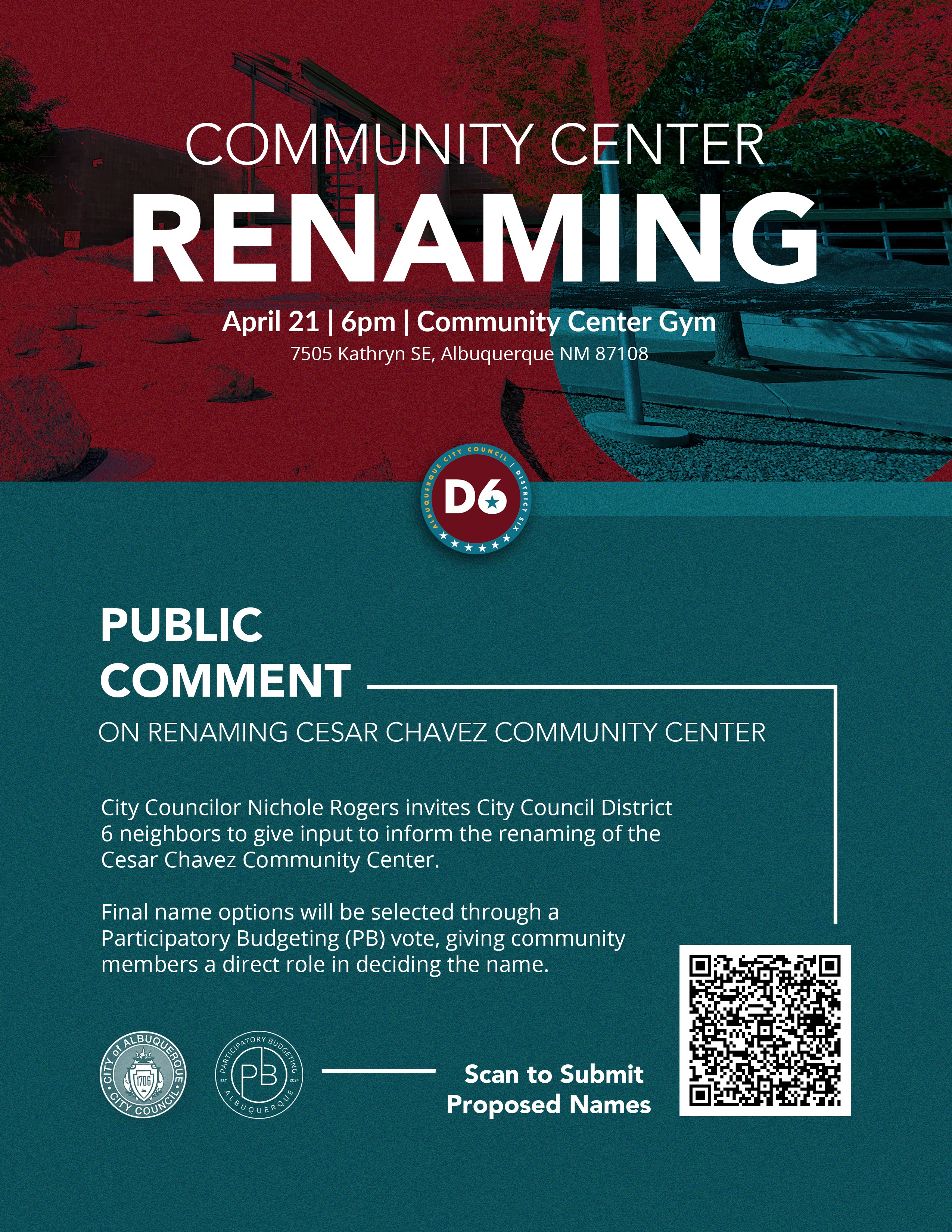 Public Comment Submission Online: Submit online suggestions via City Councilor Rogers’ website: https://www.cabq.gov/council/find-your-councilor/district-6/comment-cesar-chavez-community-center