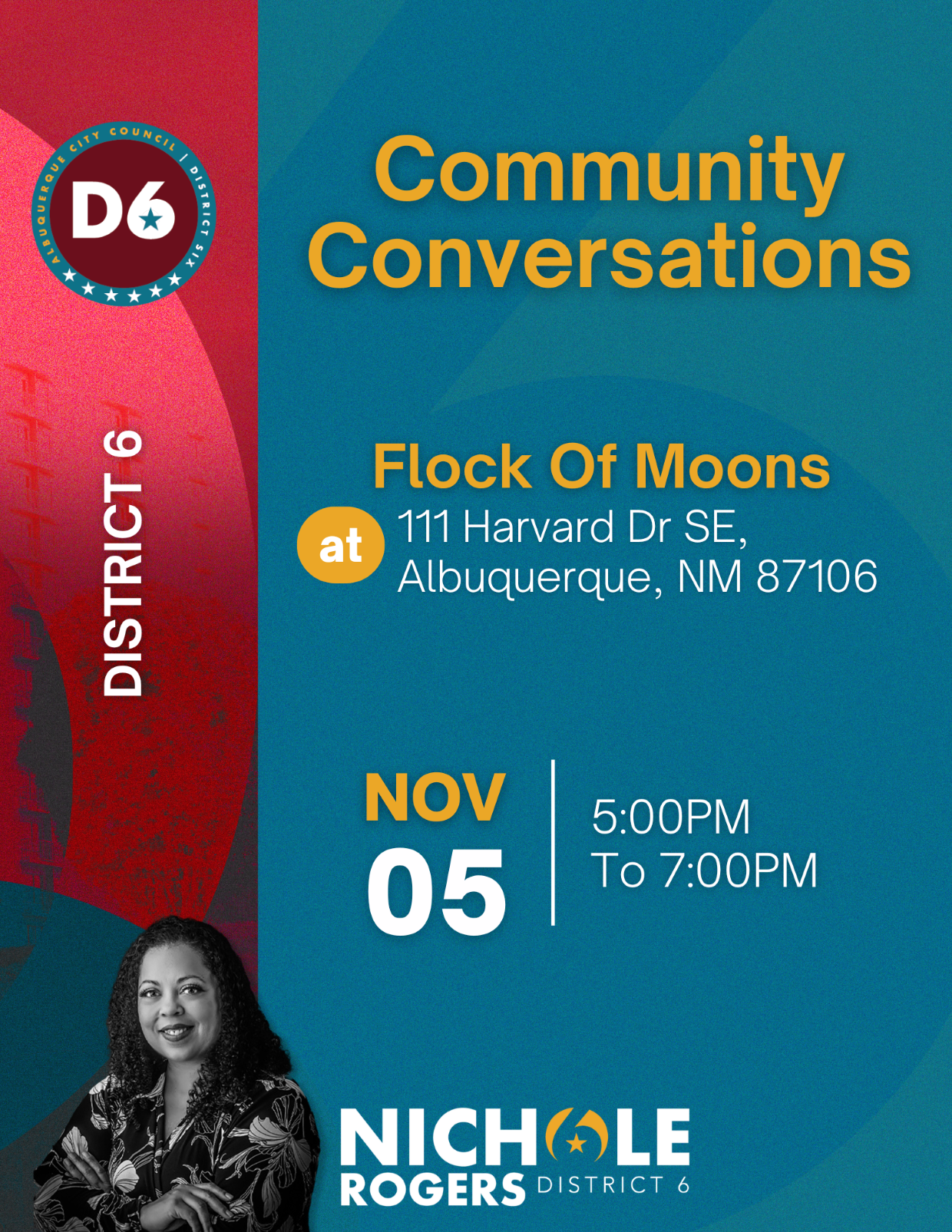 Join the conversation with Councilor Rogers and the District 6 Community! November 5, 2026 from 5p-7p at Flock of Moons!