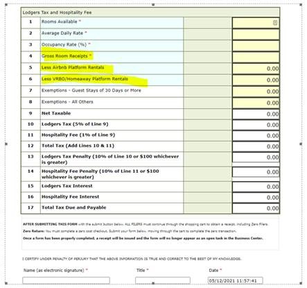 Yes, even though your taxes and fees are remitted via AirBnb and/ or VRBO, you will still need to report every month by the 25th for the previous month using the tax form illustrated below. You will need to fill in the following amounts for the lines highlighted in yellow: