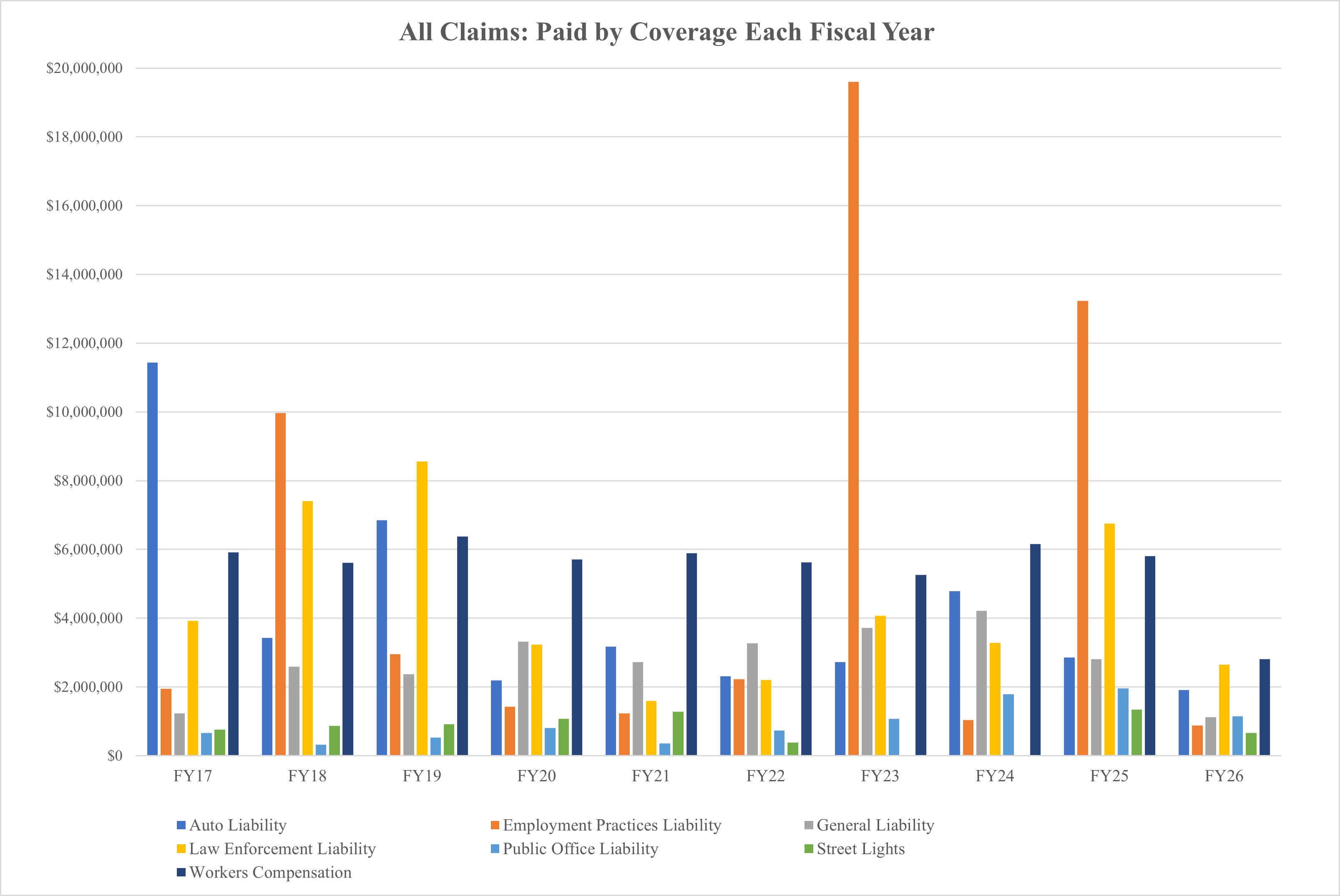 All Claims Paid bar graph showing the amount of claims paid by coverage type for each fiscal year from 2017 to 2026. Data in table below. Updated Jan. 27, 2026.