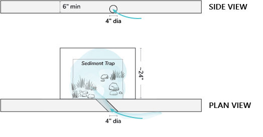 - Ensuring the top of the sediment trap is 1–2” below the bottom edge of the curb cut. Sediment traps can be constructed from large pavers, flagstone, or well-fitted 4”-8” rock. Create a lip on the backside of the sediment trap by placing a stone or paver vertically.