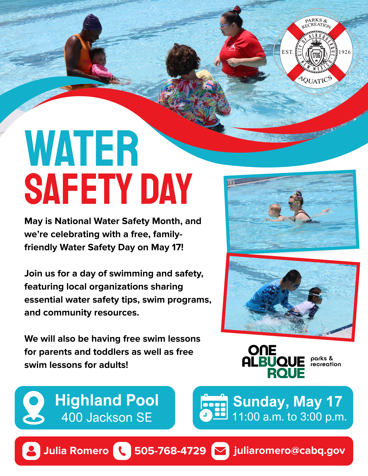 May is National Water Safety Month, and we’re celebrating with a free, family - friendly Water Safety Day on May 17 at Highland Pool!