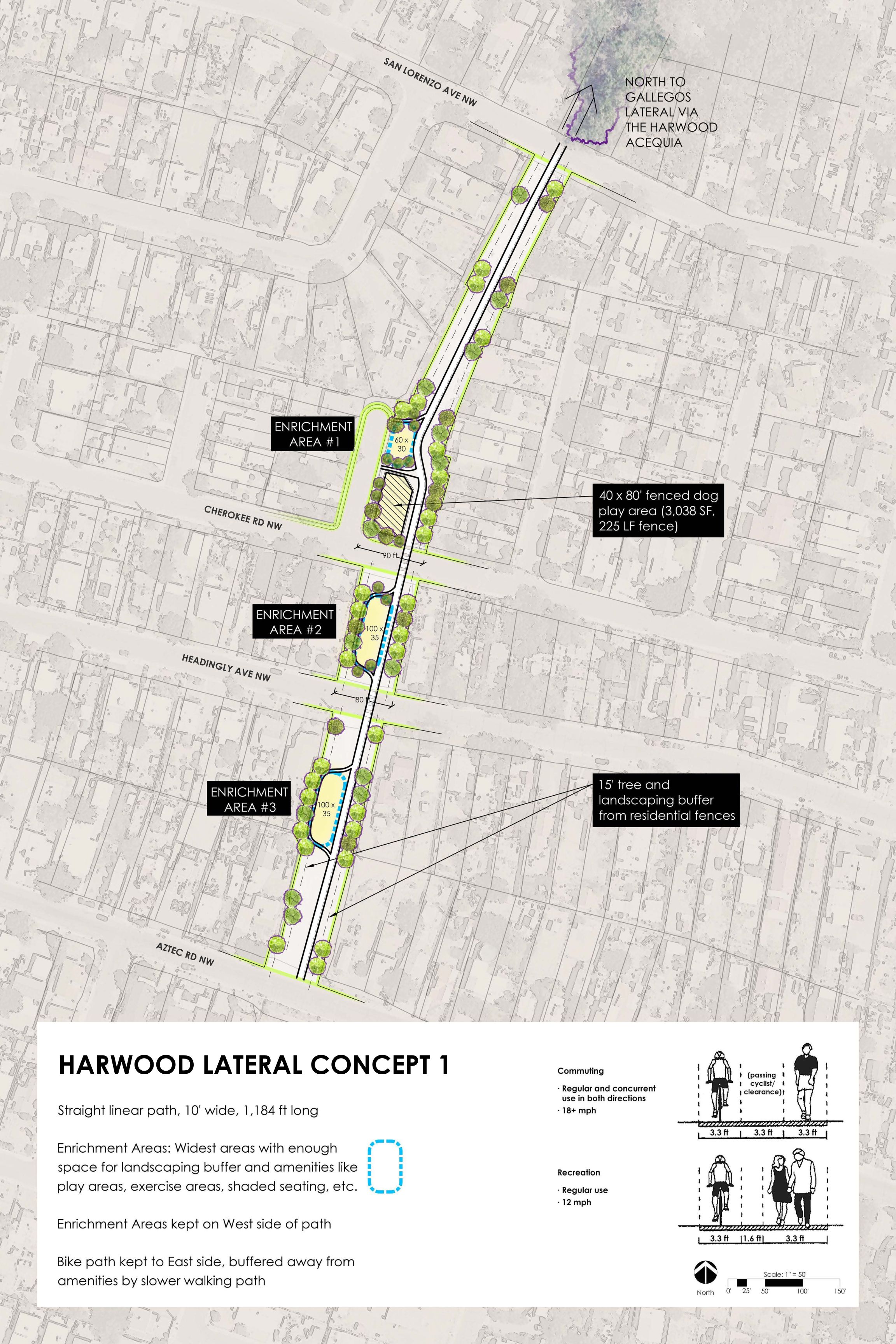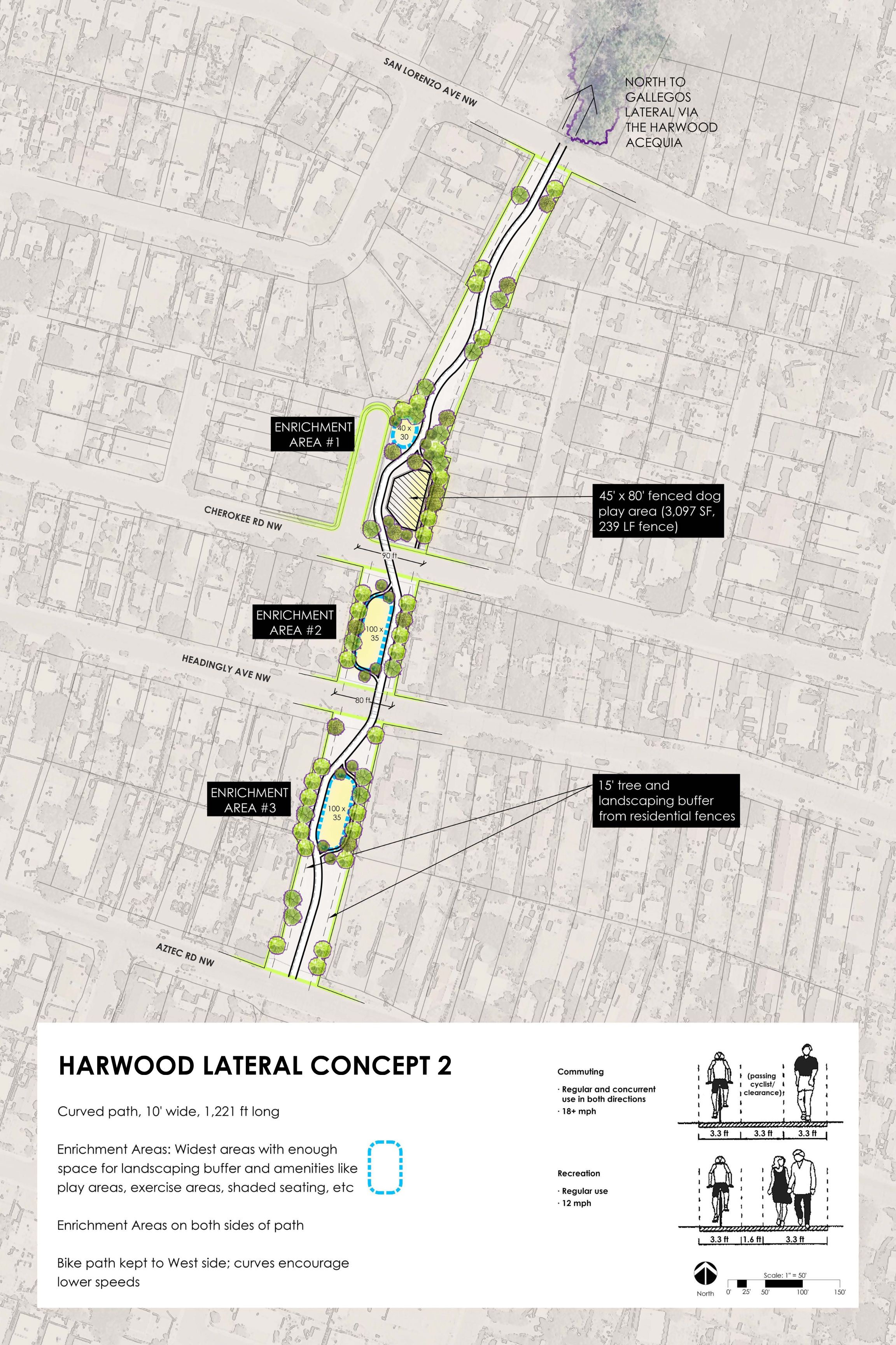 Conceptual Plan for a linear park, trail, dog park, and trees at the southern end of the MRGCD Harwood Lateral Acequia in the Near North Valley.
