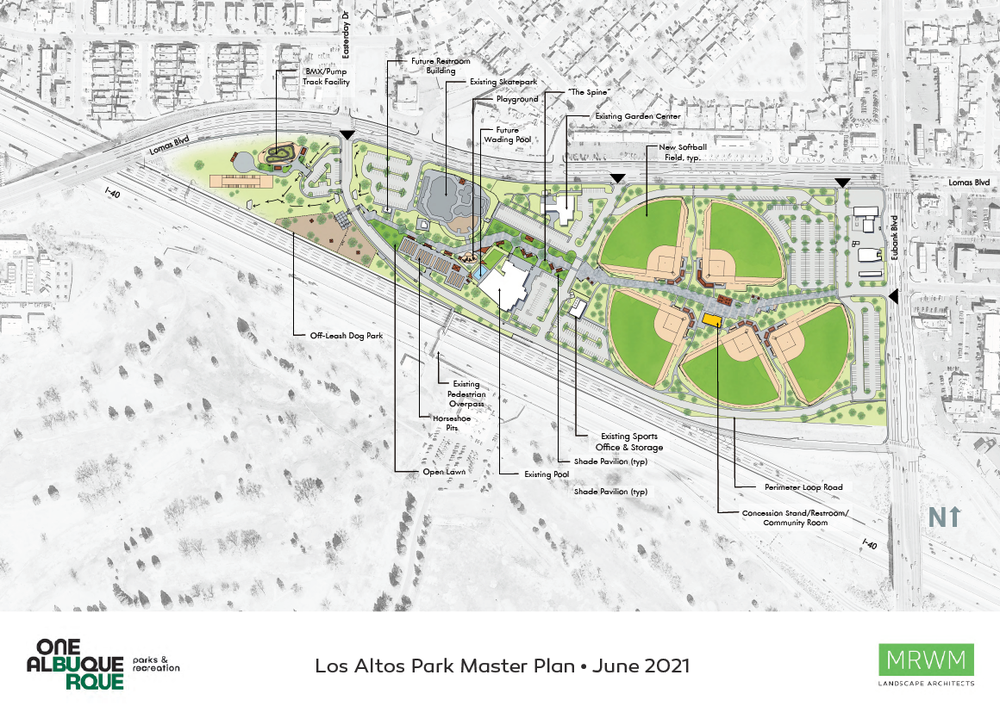Complete renovation of the eastern portion of Los Altos Park leads off phase 1 also adding another softball field. This includes everything east of the access road from Lomas Blvd. NE to the Albuquerque Garden Center and Los Altos Pool.