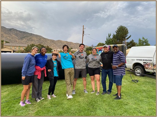 A group of City of Albuquerque Parks and Recreation employees standing in a line on the grass at a park and smiling at the camera.