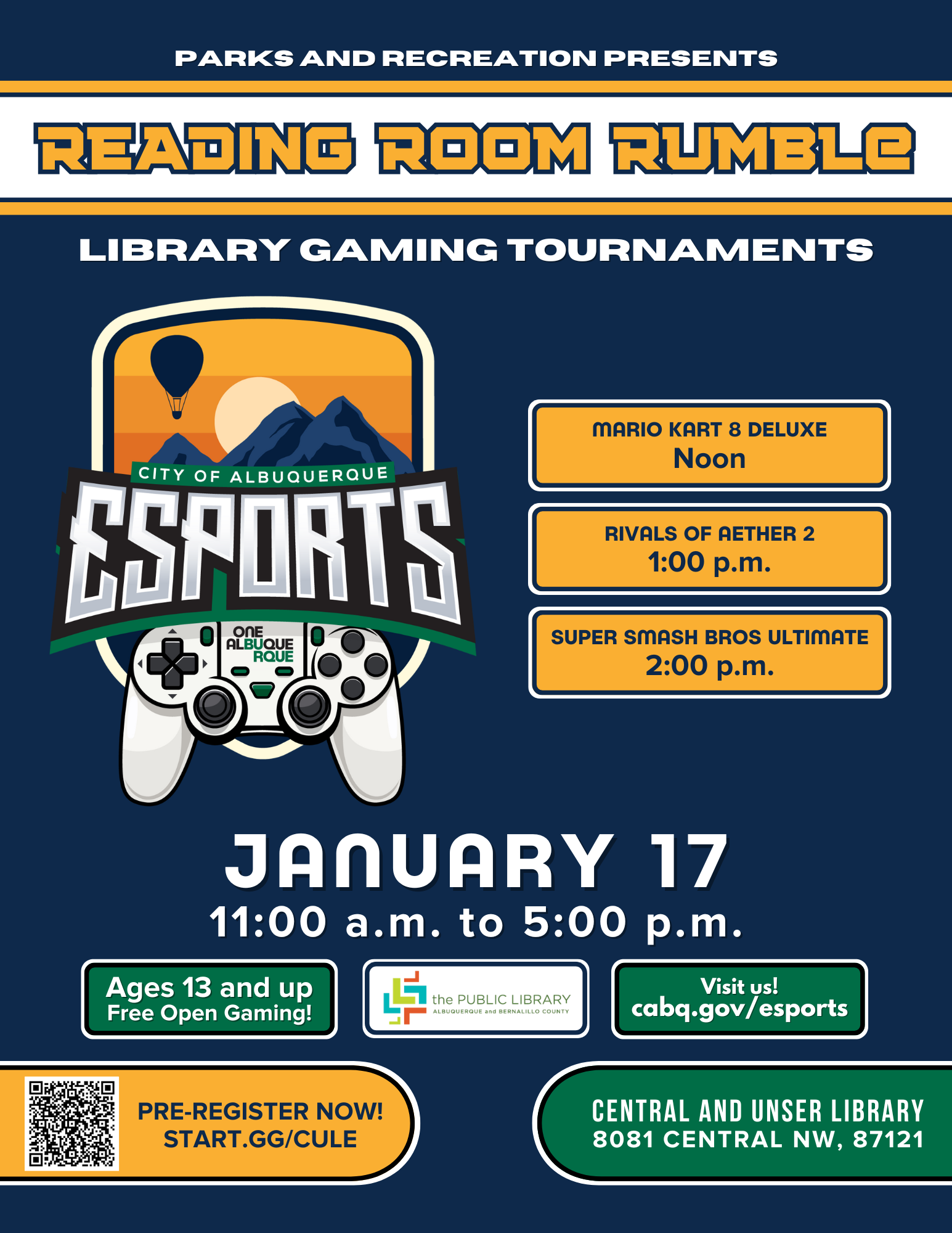 Reading Room Rumble is your free local video game tournament hosted by Parks and Recreation! Parent/Guardian supervision required for ages 12 and under.