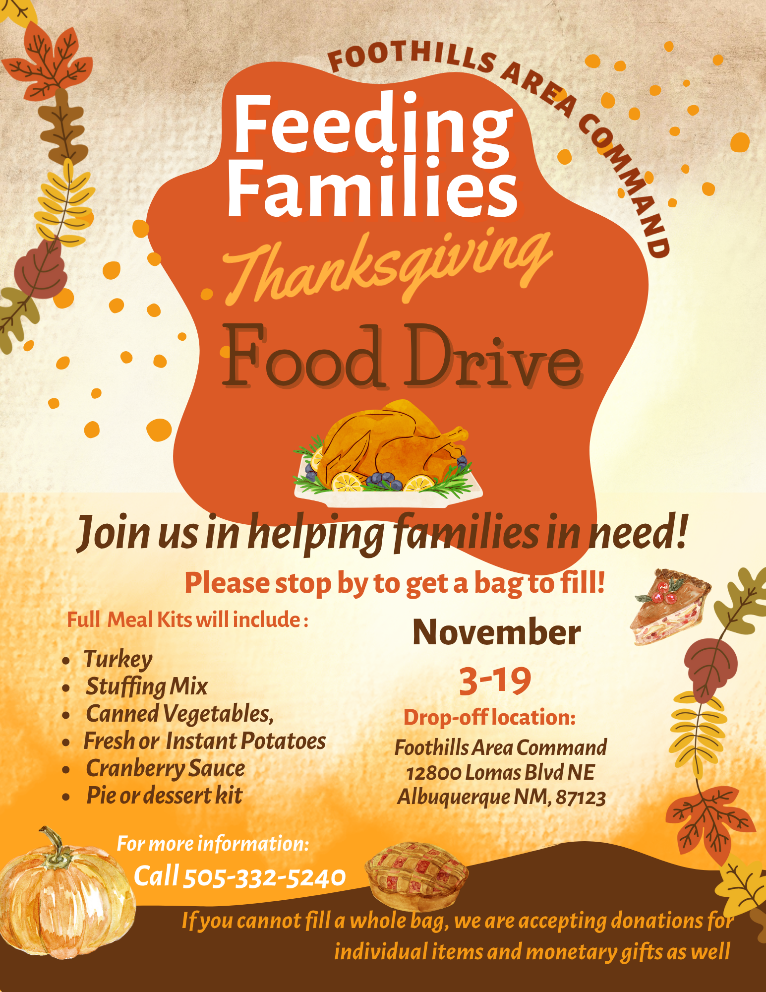 Foothills Area Command is hosting a “Fill a Bag” Food Drive to help local families this Thanksgiving! You may pick up a bag to fill starting Tomorrow, 11/5/25. Drop off food at 12800 Lomas NE by November 19th. If you cannot fill an entire bag, we will be accepting non-perishables that are NOT expired (any expired food will be sent back with you). If you do not have the time to shop for a holiday meal but would like to donate monetarily, we will be accepting those gifts in the form of a check made out to the APD Chaplain Unit. We’re teaming up with a local elementary school to connect with families in need. Thank you for helping us make a difference in our community!