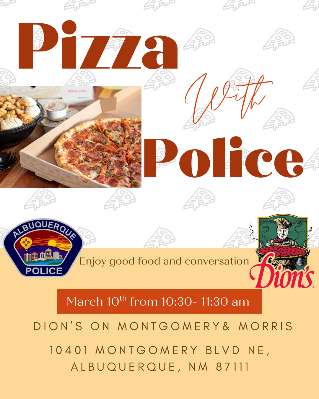Join our Foothills Area Command for Pizza with Police this Tuesday, March 10th at the Dion's located at 10401 Montgomery Blvd from 10:30 am - 11:30 am.