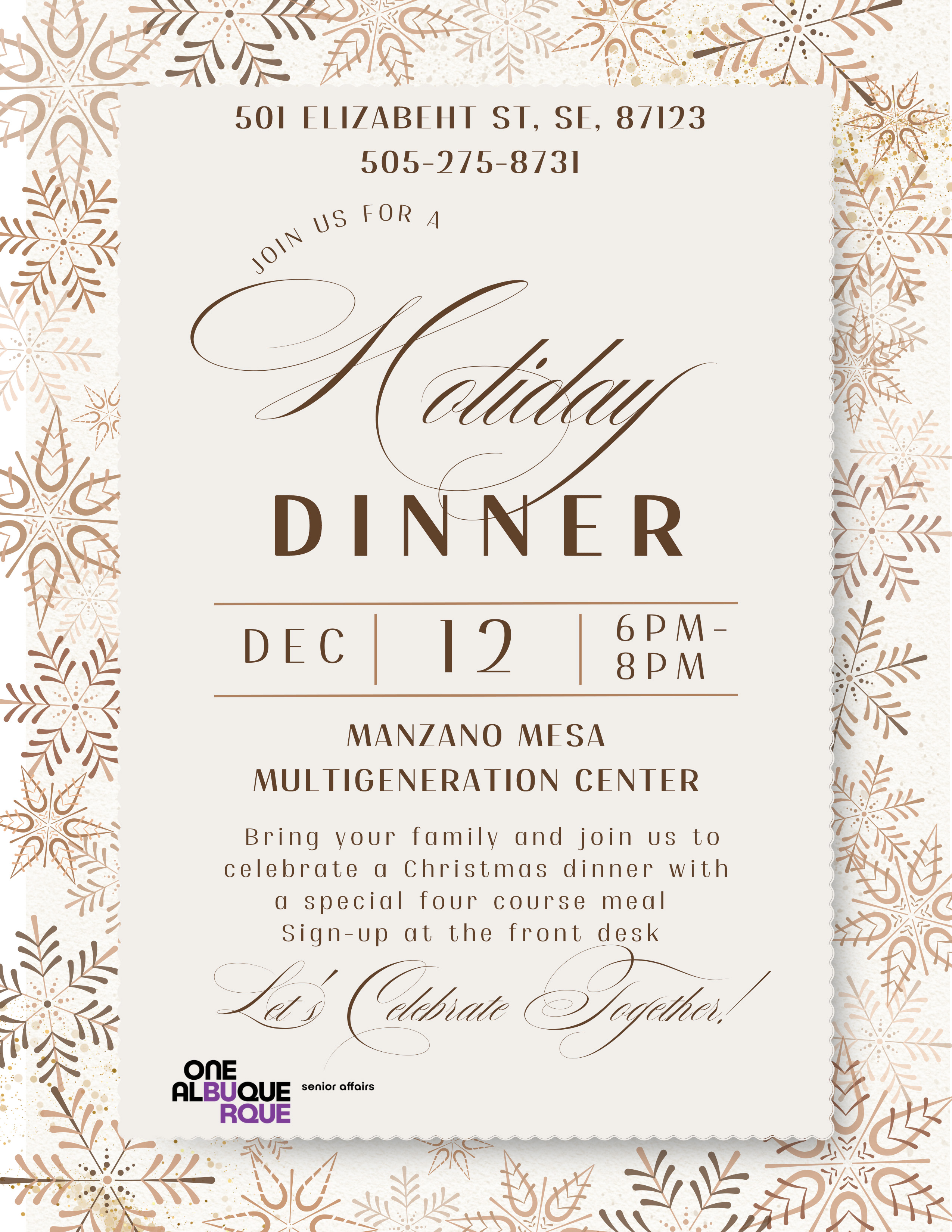 Bring your family and join us to celebrate a Christmas dinner with a special four course meal. Sign-up at the front desk!
