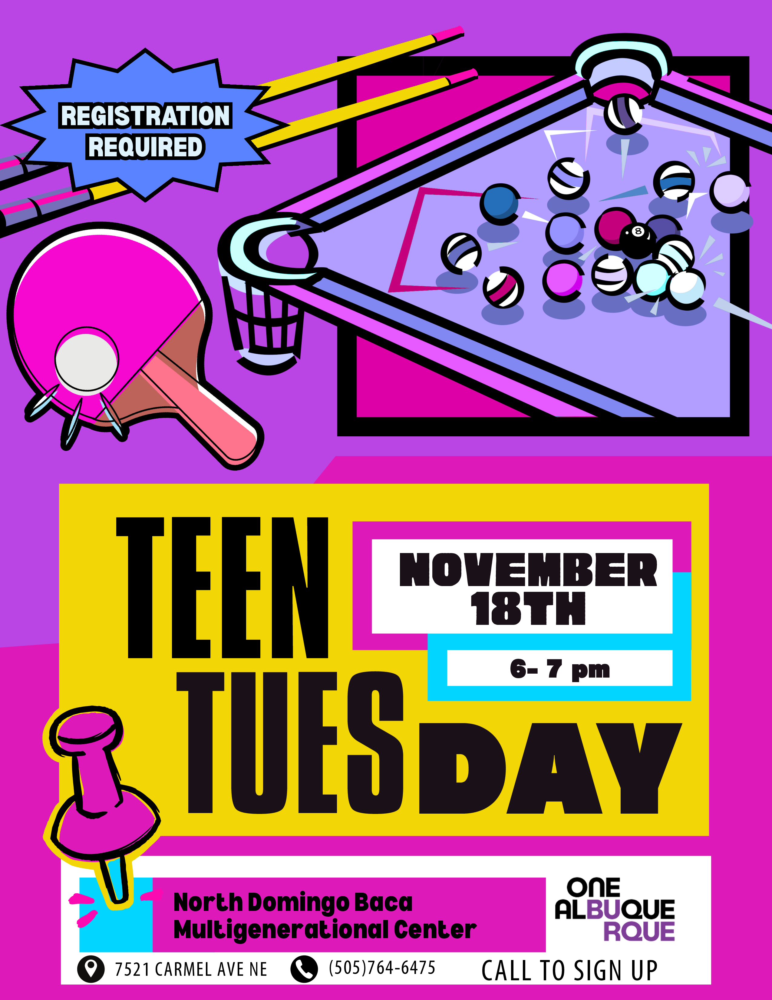 Stop by for Teen Tuesday on Tuesday, November 18, 2025 from 6 to 7 pm at North Domingo Baca Multigenerational Center. Join us for games, snacks, music, and good times!