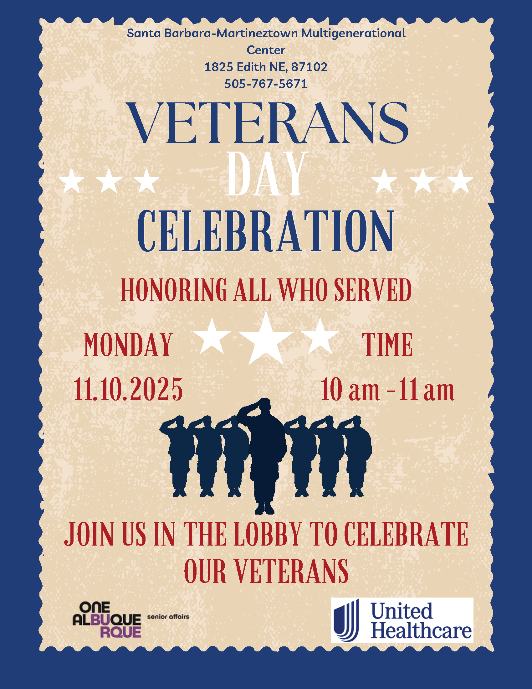 Join us at Santa Barbara Martineztown Multigenerational Center on Monday, November 10, 2025 as we honor our veterans.